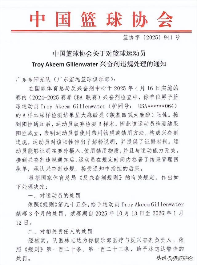 在国家体育总局反兴奋剂中心于2025年4月16日实施的赛内兴奋剂检查中,你单位男子篮球运动员吉伦沃特的A样本尿样检测结果呈大麻酚类(羧基四氢大麻酚)阳性。