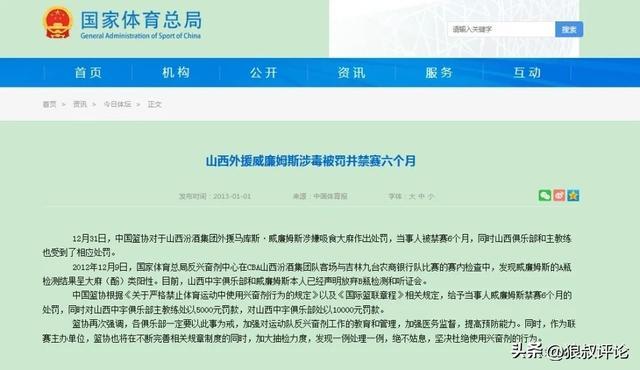 中国篮协根据《关于严格禁止体育运动中使用兴奋剂行为的规定》以及《国际篮联章程》相关规定,给予当事人威廉姆斯禁赛6个月的处罚,同时对山西中宇俱乐部主教练处以5000元罚款,对山西中宇俱乐部处以10000元罚款。