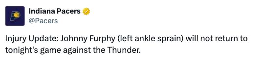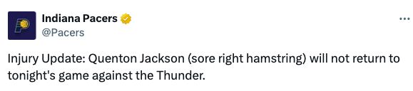 本场比赛步行者接连遭遇打击,先是宣布昆顿·杰克逊因为右腿筋疼痛提前退出比赛,接着又宣布约翰尼·弗菲因为左脚踝扭伤退出比赛。