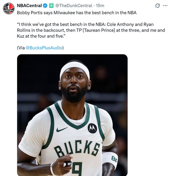 波蒂斯认为,雄鹿拥有全NBA最强的替补席阵容:“我们后场有科尔·安东尼和罗林斯,三号位有普林斯,四号位和五号位有我和库兹马。”