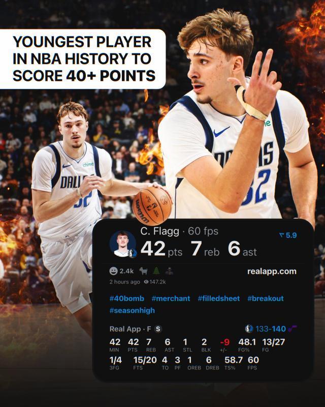 北京时间12月16日,独行侠加时133比140不敌爵士,但球队新科状元秀库珀·弗拉格迎来了生涯之夜。此役他出战42分钟,27投13中,罚球20罚15中,狂砍42分7篮板6助攻2盖帽1抢断,成为NBA历史最年轻的40+先生。