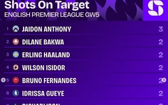英超第5轮射正榜:杰顿安东尼3次居首,哈兰德等9名球员两次