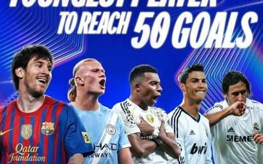 欧冠历史打进50球最年轻球员排行:梅西以24岁284天居首