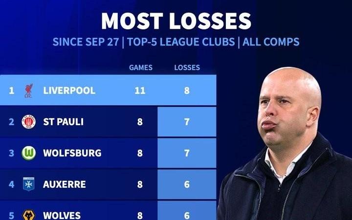 11场输8场,利物浦是自9月底以来五大联赛输球场次最多的队