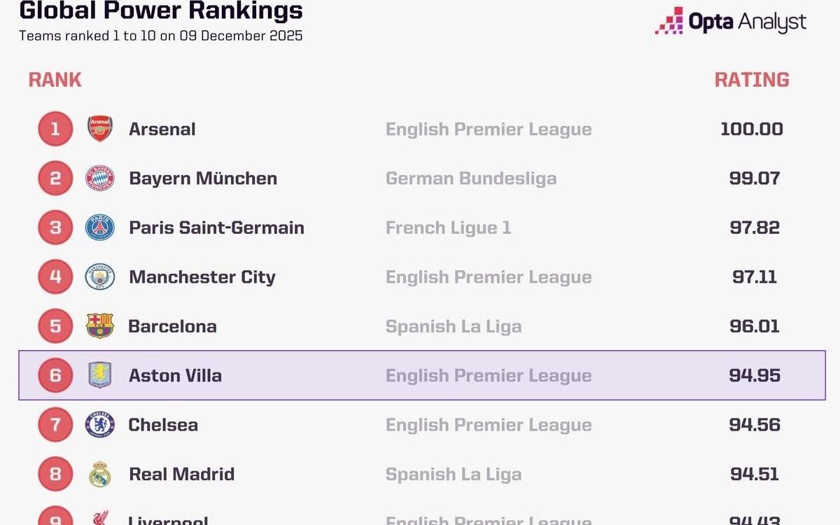 Opta全球俱乐部当前实力榜:阿森纳、拜仁、巴黎前3,维拉第6