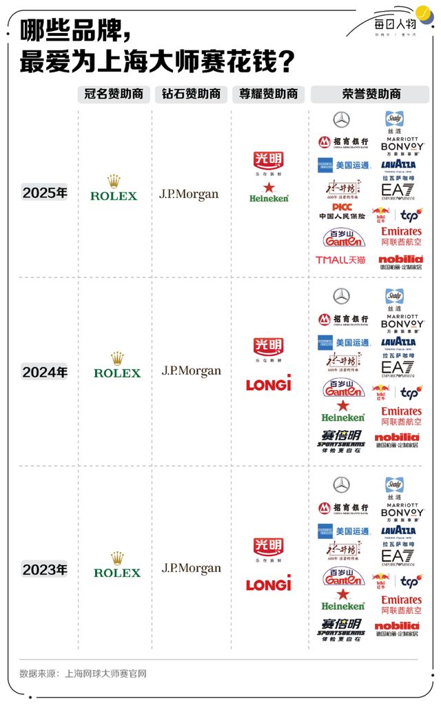 同样引人注目的是上海大师赛。作为中国赛季另一场重头戏,该赛事共吸引46家赞助商支持,在全部9站ATP1000大师赛中赞助商数量高居榜首。除了长期担任冠名赞助商的劳力士,意图强化本土客户形象的摩根大通,光明乳业和喜力一同分享了第三级赞助商的位置。其中,光明乳业成为该赛事中赞助等级最高的本土品牌。