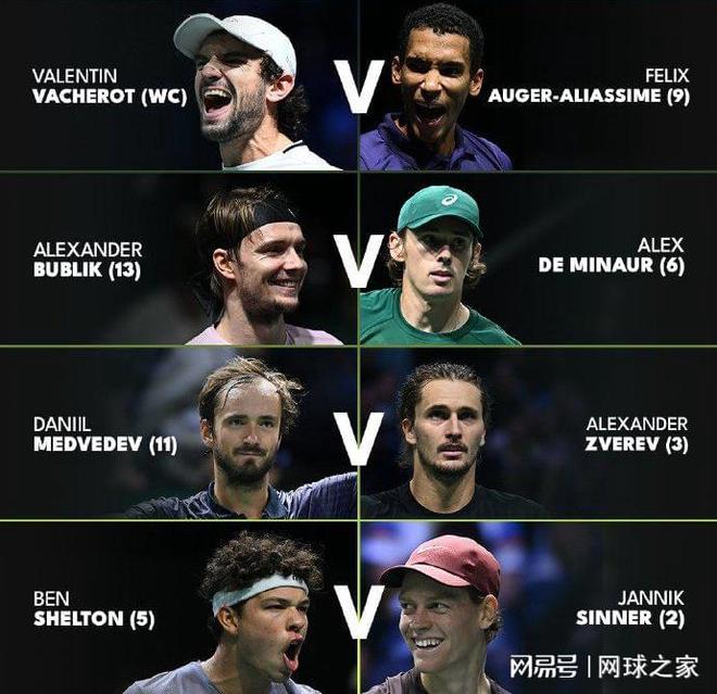 八强战对阵如下:上半区,瓦舍罗vs 阿利亚西姆、布勃里克vs 德米纳尔;下半区,梅德维德夫vs兹维列夫、谢尔顿vs辛纳。
