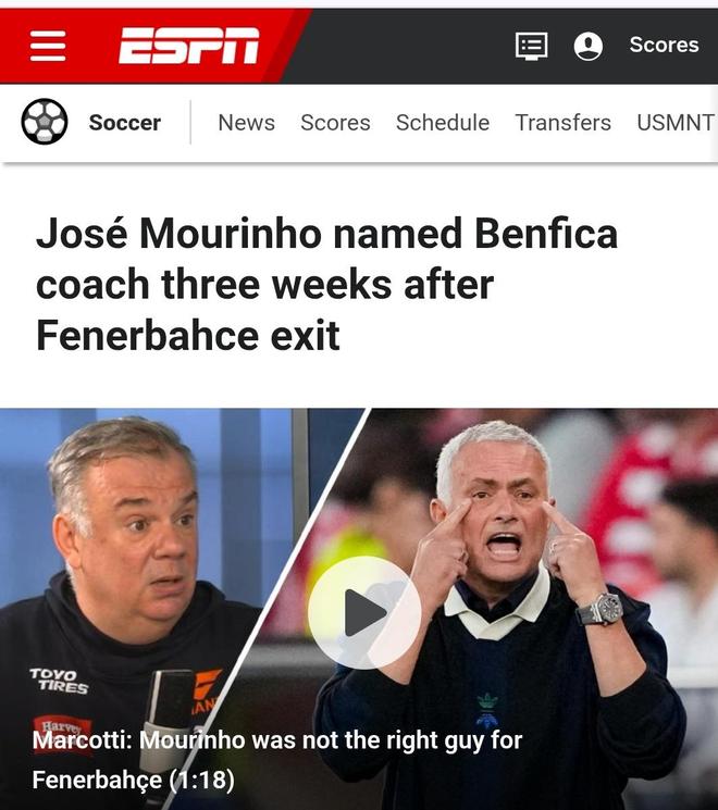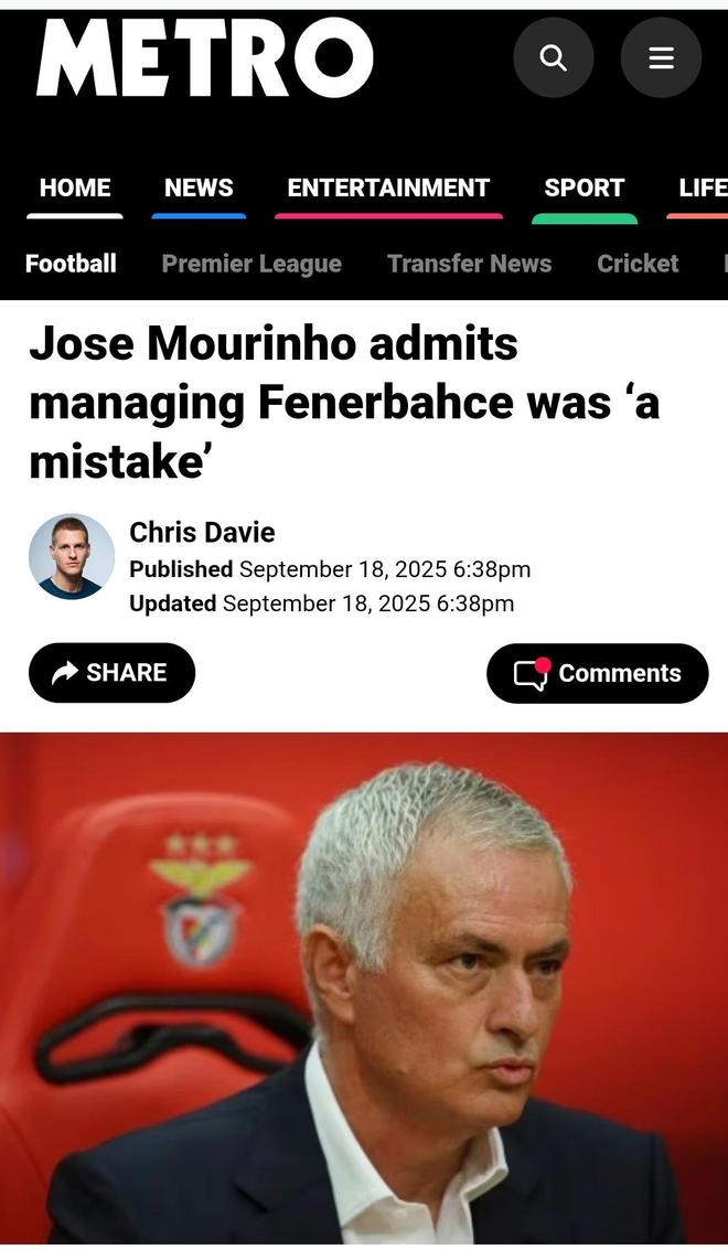 英国《地铁报》(Metro)则以《穆里尼奥:执教费内巴切是一个错误》为标题,报道了穆里尼奥对老东家的不满,他在新闻发布会上表示:"我做了错误的选择,但我并不后悔,我不该去费内巴切执教的,那里的足球文化和我想象的不同,我一直在尽我最大的努力,但没有成功,现在我来到了本菲卡,这是世界上最好的俱乐部之一,这里更适合我。"