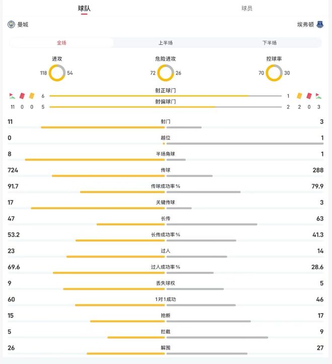 雷速体育10月18日讯 在今晚结束的英超第八轮的一场比赛中,曼城2-0战胜埃弗顿。曼城前锋哈兰德本场比赛梅开二度,在前八轮英超中,哈兰德已经打进了11粒进球,效率非常惊人。埃弗顿方面,恩迪亚耶表现非常活跃,但没能帮助球队取得进球。格拉利什因租借回避原则,无缘出战曼城。