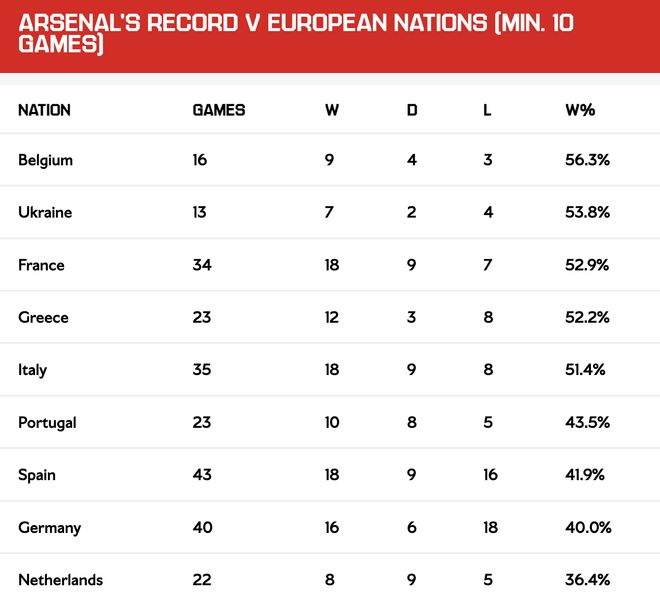 欧冠对西甲球队6连胜后,阿森纳对西甲球队的胜率已经超过40%,达到41.9%。如若此番击败马竞,阿森纳将第19次击败来自西班牙的球队。而西班牙也将正式成为阿森纳取胜次数最多的联赛国别。