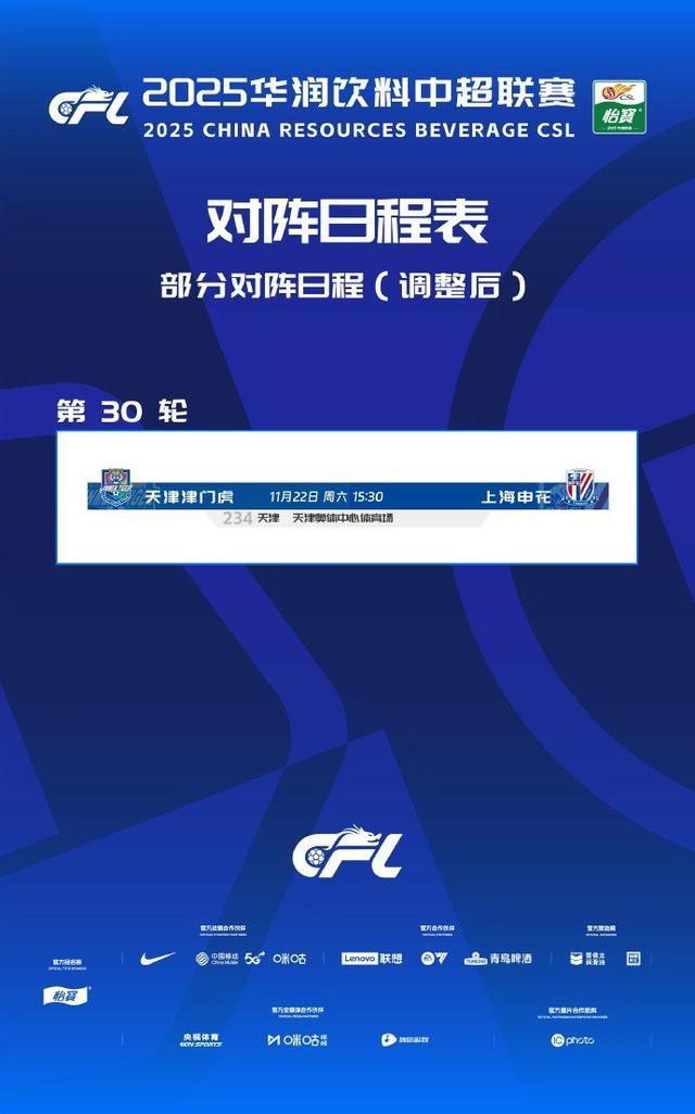 中超官方写道:根据2025华润饮料中超联赛赛程,天津津门虎对阵上海申花比赛将于11月22日15:30在天津泰达足球场进行,为最大限度满足球迷的观赛需求,同时保证本场比赛安全有序进行。经天津津门虎足球俱乐部申请,协商天津赛区、上海申花足球俱乐部以及有关方面同意,现决定将天津津门虎对阵上海申花比赛进行调整。