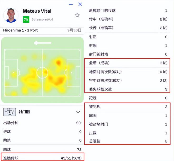 同时中场外援维塔尔起到了不小的作用,他全场比赛传球成功率高达96%,12次一对一对抗赢下8次,还有5次成功防守数据,2次制造对方犯规,只丢了9次球权。
