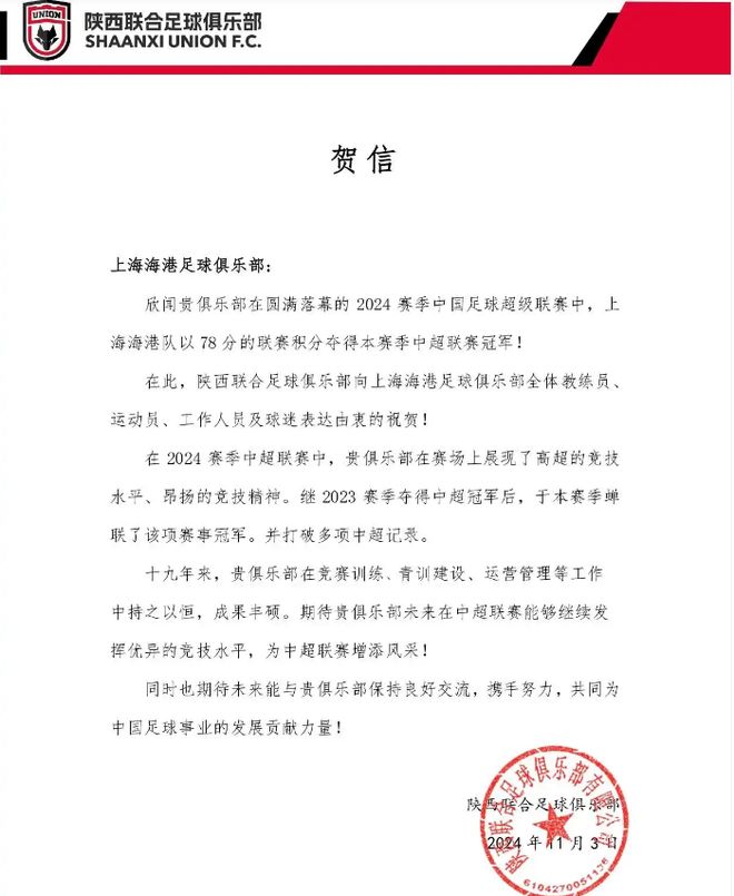 虽然海港三连冠时没见陕西联合的贺电,但2024赛季海港夺取两连冠时,当时尚在中乙的他们是发过贺电的(下图)。